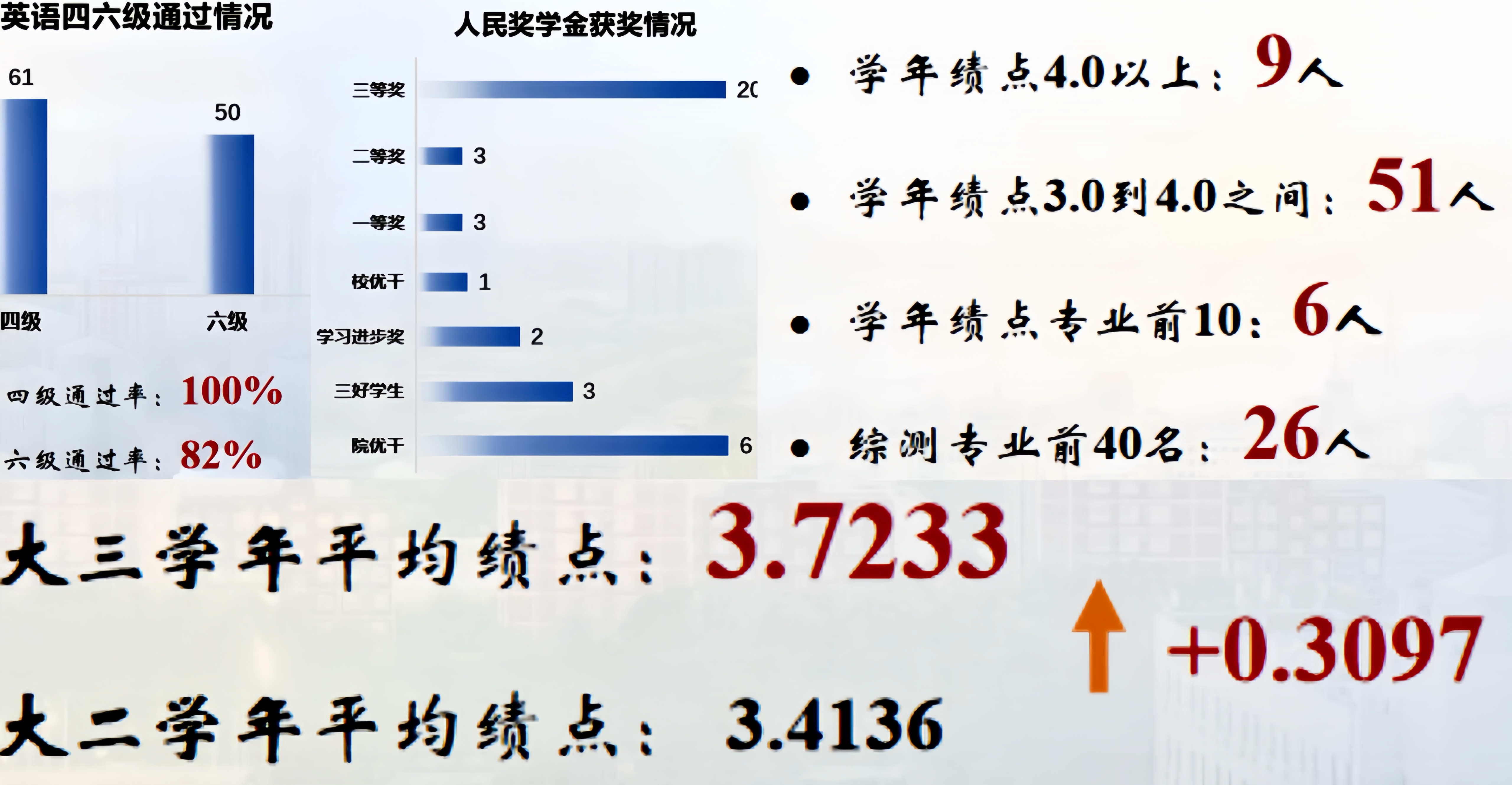 22公管2始终笃学力行,以扎实的学业根基与卓越的综合素养为青春筑基。过去一年,学业成绩实现跨越式提升,班级平均绩点从3.41显著增长至3.72;共有26人荣获人民奖学金,占比高达专业总人数65%。在语言能力上,班级四级通过率达100%,六级通过率82%。