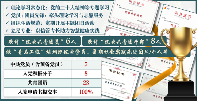 班集体的力量,始于思想的凝心聚力。22信管班始终将思想建设放在首位,班级现有23名团员、5名中共党员、8名入党积极分子,入党申请书提交率100%。