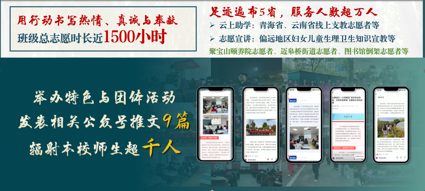 不仅在思想上追求进步,他们更在实践中锤炼初心——从青海线上支教到南京马拉松志愿服务,从唐仲英爱心书洞到校庆70周年校园志愿,累计志愿服务时长近1500小时。这些点滴星光,最终汇成温暖有力的集体底色,让“保持热爱、奔赴山海”成为班级的共同信念。