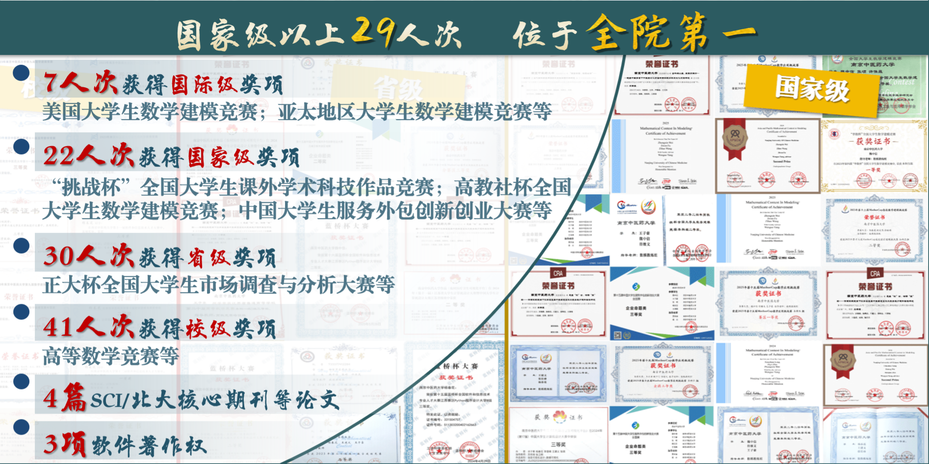 如果说学业是内力,那创新就是22信管向外拓疆的锋芒。过去三年,班级累计取得校级以上竞赛奖项100人次,稳居全院第一。其中包括国际级7人次、国家级22人次。此外录用SCI/北大核心等论文4篇、取得软件著作权3项,他们一路前行,一路成长。
