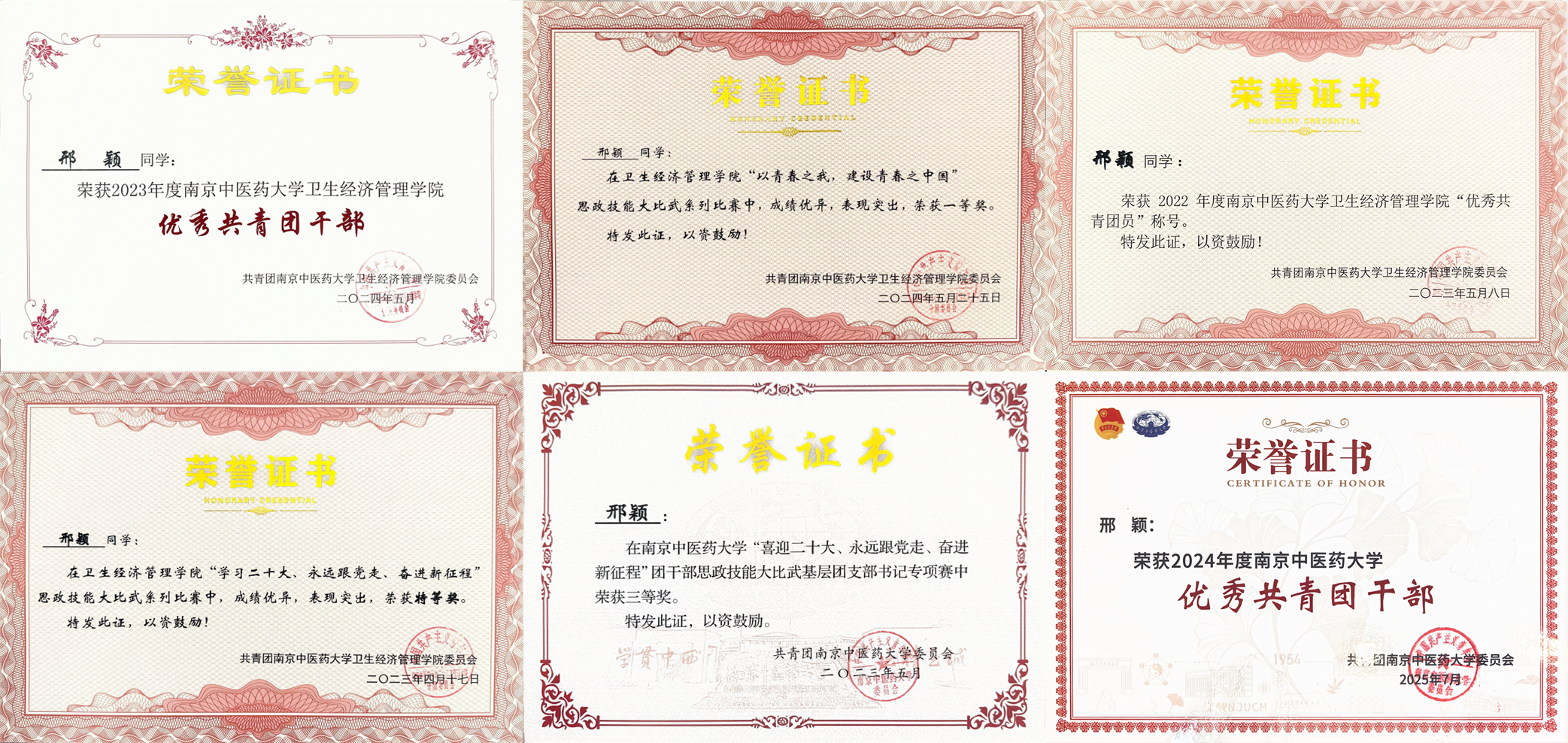 邢颖,女,中共党员,就读于南京中医药大学卫生经济管理学院2022级国际经济与贸易专业,现任22国贸班长,曾任22国贸团支书、校团支部成长驿站学生副书记,获十佳团支书等称号。连续三年绩点、综测均位列专业第一,获国家奖学金等荣誉21项,推免至中国药科大学攻读硕士学位。在科研方面,以第一主创负责一项省级大创,以核心成员参与一项校级大创;在竞赛方面,累计获国奖4项,省奖3项,校奖3项;主办班级活动60余次,累计获5项集体荣誉;在社会实践方面,积极参与直播助农、关爱老人等志愿服务,三次深入基层展开调查,志愿服务总时长50余小时,入户服务60家。