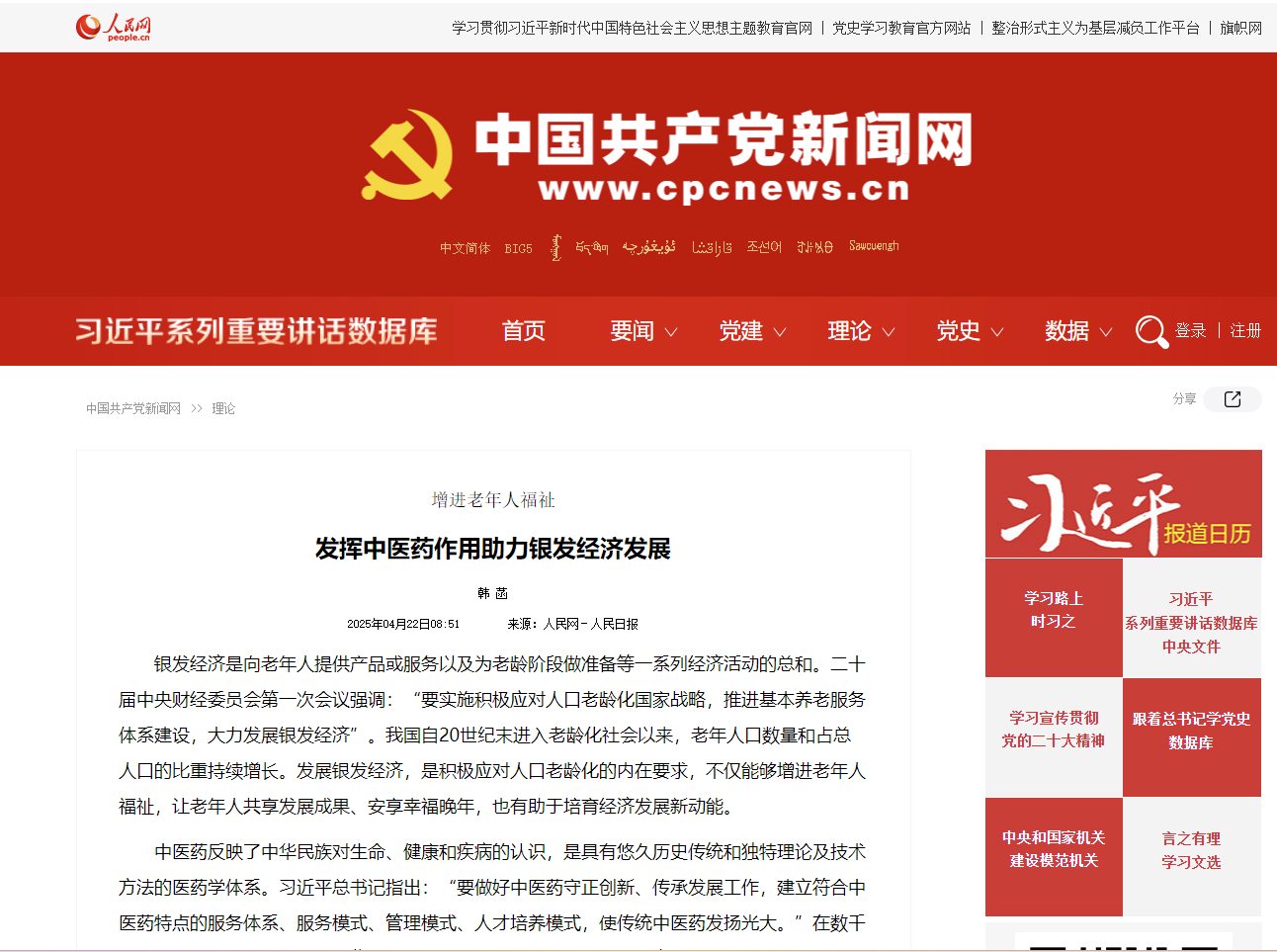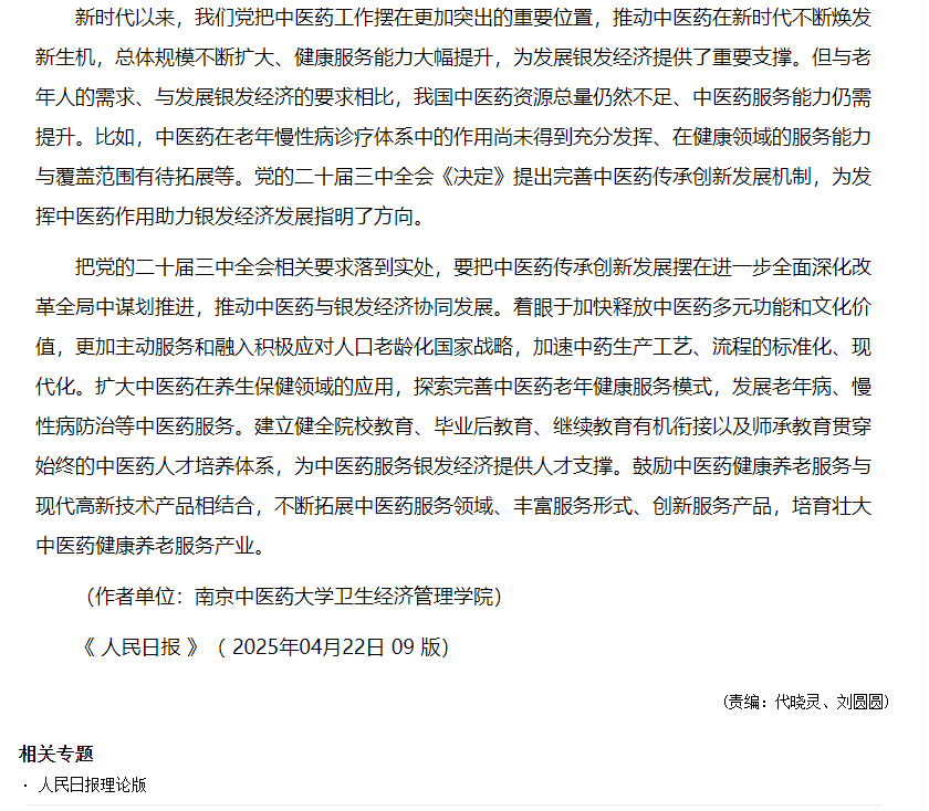 《 人民日报 》2025年4月22日 第9 版发表了我院韩菡老师的《增进老年人福祉——发挥中医药作用助力银发经济发展》的署名文章。以下为文章内容。