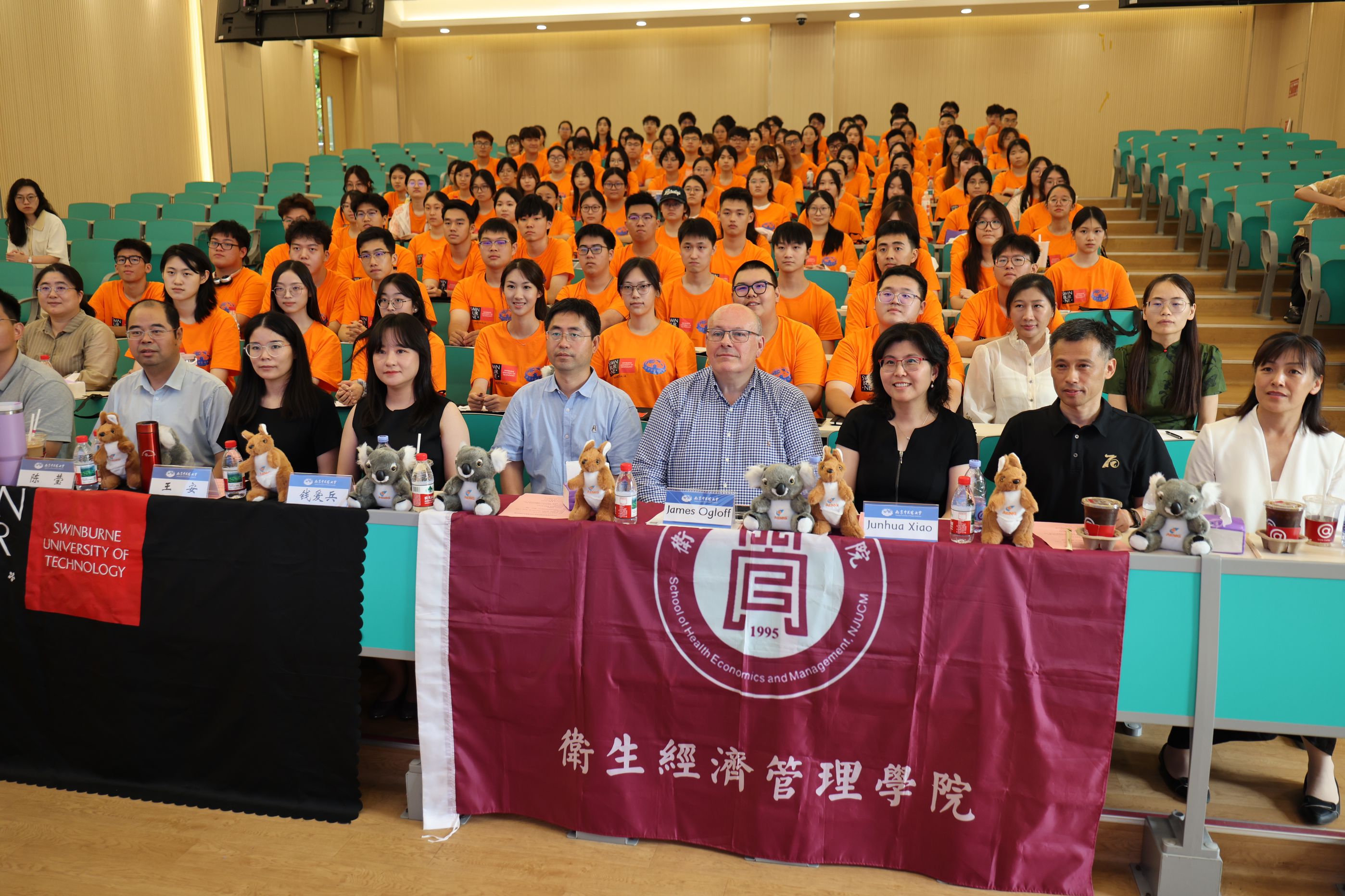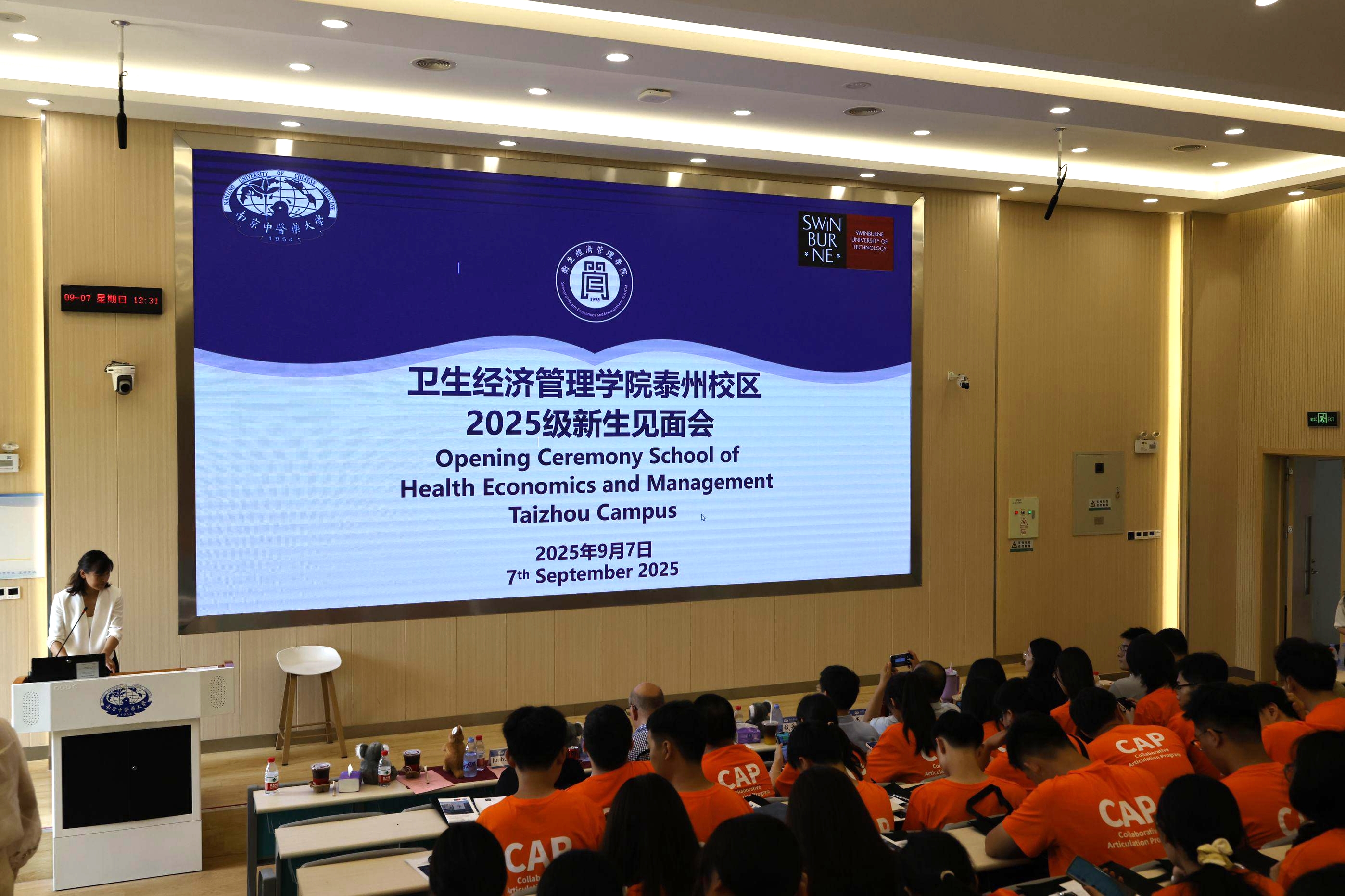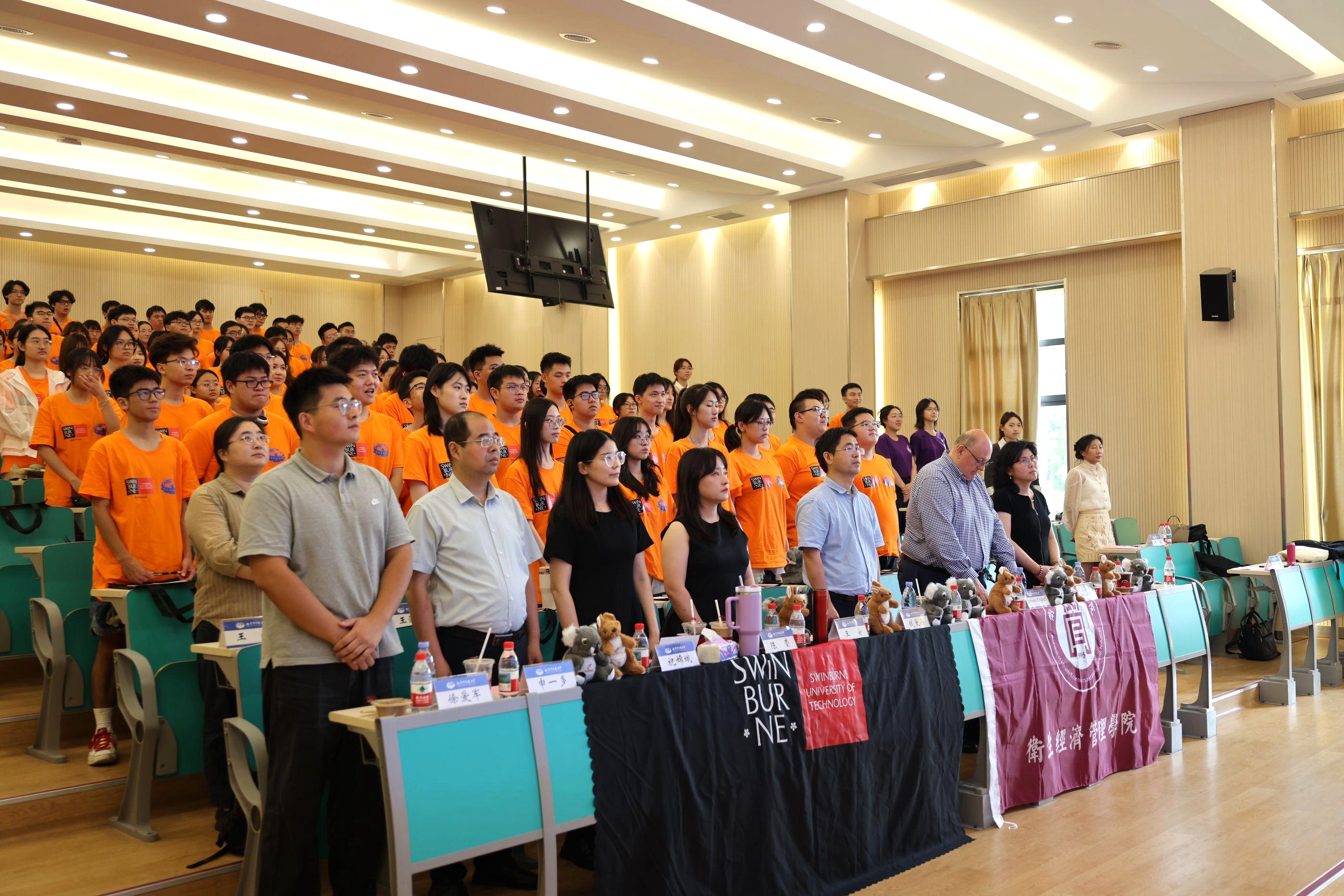 2025年9月7日中午,卫生经济管理学院2025级泰州校区新生见面会暨入学教育大会在J2-102教室隆重举行。斯威本科技大学健康科学学院院长James Ogloff、合作项目学术主任Junhua Xiao以及卫生经济管理学院院长徐爱军,党委副书记、副院长沈静,副院长钱爱兵,公共事业管理专业(中澳合作办学项目)教师代表、辅导员代表参加会议。大会由学院党委副书记、副院长沈静主持。