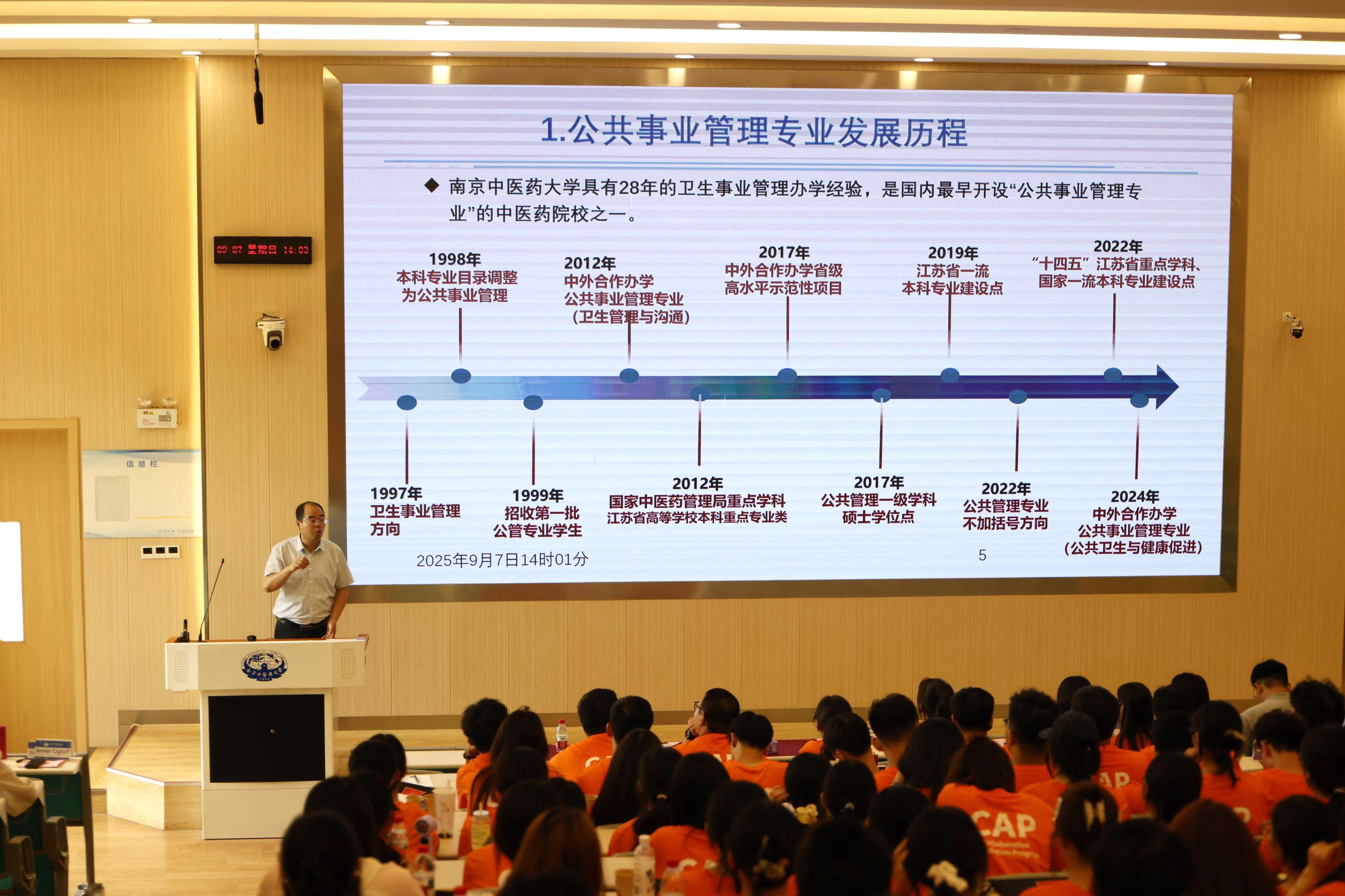 新生见面会后,卫生管理系主任王安老师向同学们详细介绍了公共事业管理(中外合作办学)专业的发展历程,并深入解读了专业的定位、特点、优势以及课程体系。王安老师强调,本专业充分整合南京中医药大学和澳大利亚斯威本科技大学的优质教育教学资源,致力于培养具备全球化视野和国际竞争力的高素质卫生健康管理人才。他鼓励同学们积极利用中外合作办学项目这一高水平、国际化的学习交流和成长平台,夯实专业理论基础、提升专业技能、培养创新能力和全球化素养,为推动构建人类卫生健康共同体贡献力量。