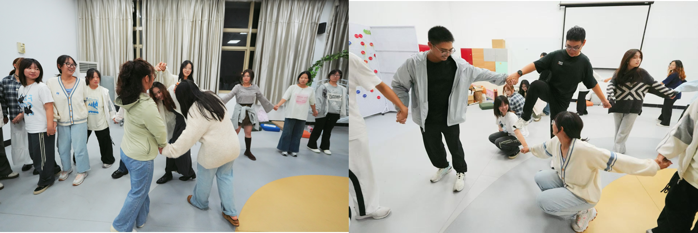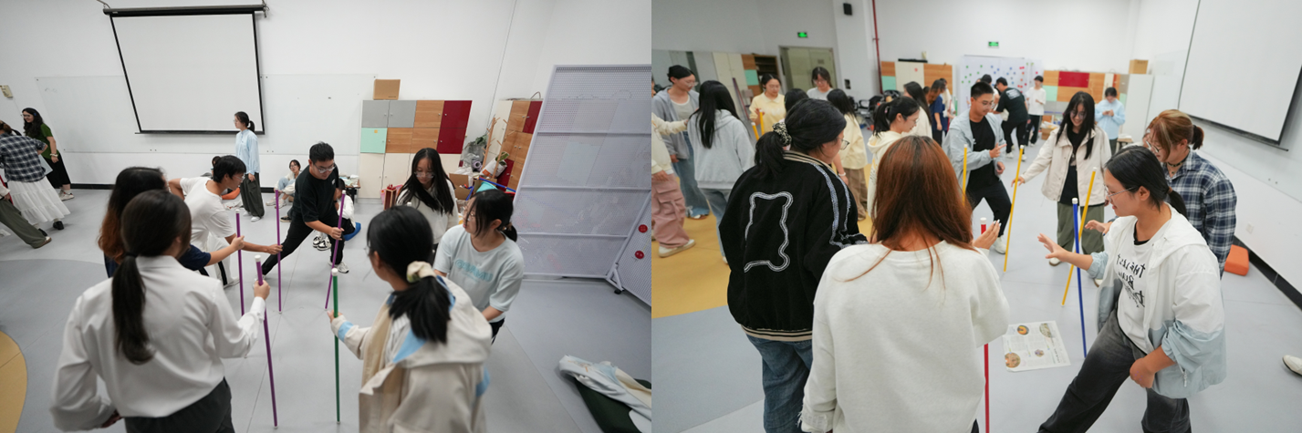 “不倒森林”游戏登场,瞬间将现场氛围推向高潮。起初,大家手中的杆子总不听使唤,左摇右晃难稳住;随着练习推进,成员们慢慢找到节奏,开始主动预判后一位同学的动作,彼此带动、相互配合。当杆子终于稳稳传递,团队默契的模样也愈发清晰。