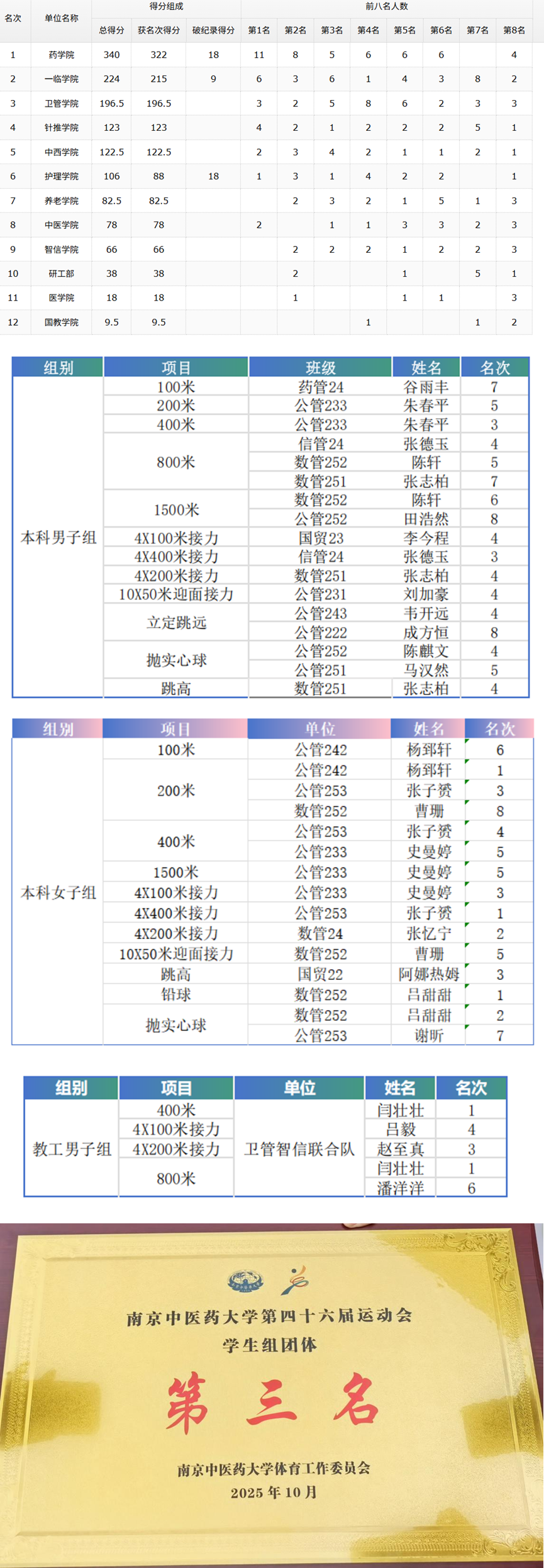 伴着渐浓的秋意,第四十六届运动会在全场的欢呼与不舍中迎来收官。那些全力以赴的奔跑、永不言弃的坚守、携手同行的温暖,共同拼凑成这个秋天里最珍贵的画面。值得全院骄傲的是,卫生经济管理学院以师生同心的奋斗姿态,不仅斩获团体积分第三名的优异成绩,更一举打破此前校运会排名前 8 的瓶颈,为学院体育赛事发展写下了突破性的一笔。