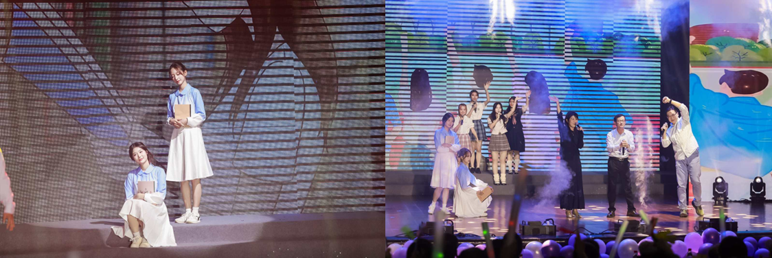 仙林、泰州两校区师生代表共同演唱的歌曲串烧《那些花儿》《原来你也在这里》《明天,你好》《同桌的你》带领全场观众重温青葱记忆,感悟成长与离别,寄托了对美好未来的憧憬。