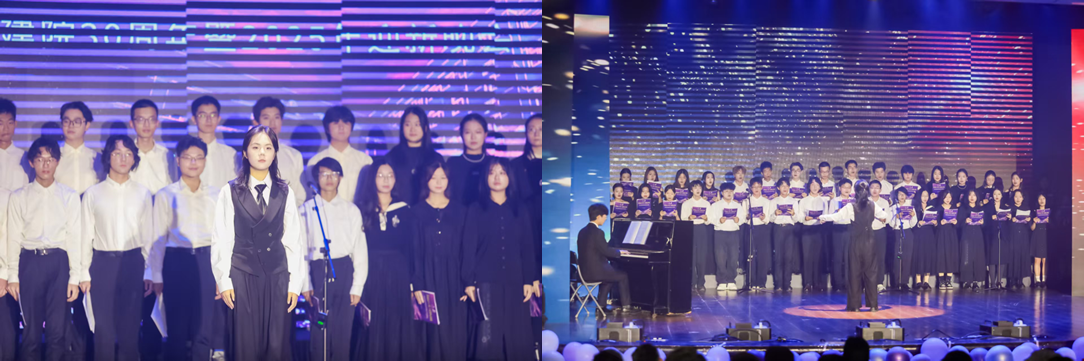 晚会在激昂人心的领唱与合唱《我们都是追梦人》中达到最高潮。学院领导、教师代表与全场学生齐声高歌,挥舞的旗帜与嘹亮的歌声交织成一幅壮丽的画卷,表达了全体卫管人将以三十周年为新的起点,携手并肩,为健康中国事业和学校发展贡献青春智慧的坚定决心。