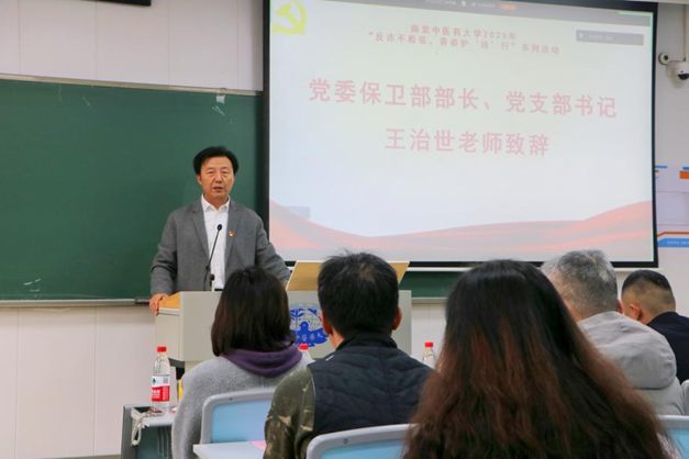 党委保卫部部长、党支部书记王治世在致辞中强调,反诈工作是校园安全的重要组成,更是党组织服务师生、践行初心使命的具体体现。他号召全体师生将反诈宣传融入日常,营造“人人识诈、人人防诈、人人反诈”的浓厚氛围,并对即将受聘的“反诈宣传员”寄予殷切期望,勉励同学们肩负起职责使命,主动传播反诈知识、劝阻潜在受骗行为,筑牢校园反诈防线。