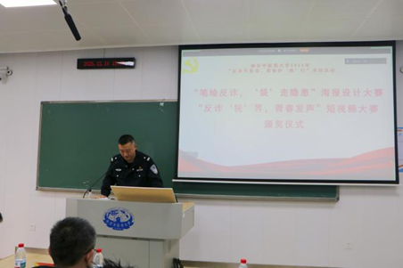 “笔绘反诈,‘袋’走隐患”海报设计大赛与“反诈‘视’界,青春发声”短视频大赛的一等奖获得者,同时获评“反诈宣传大使”荣誉称号。金警官现场宣读表彰决定,为本次表彰环节再添庄重色彩。
