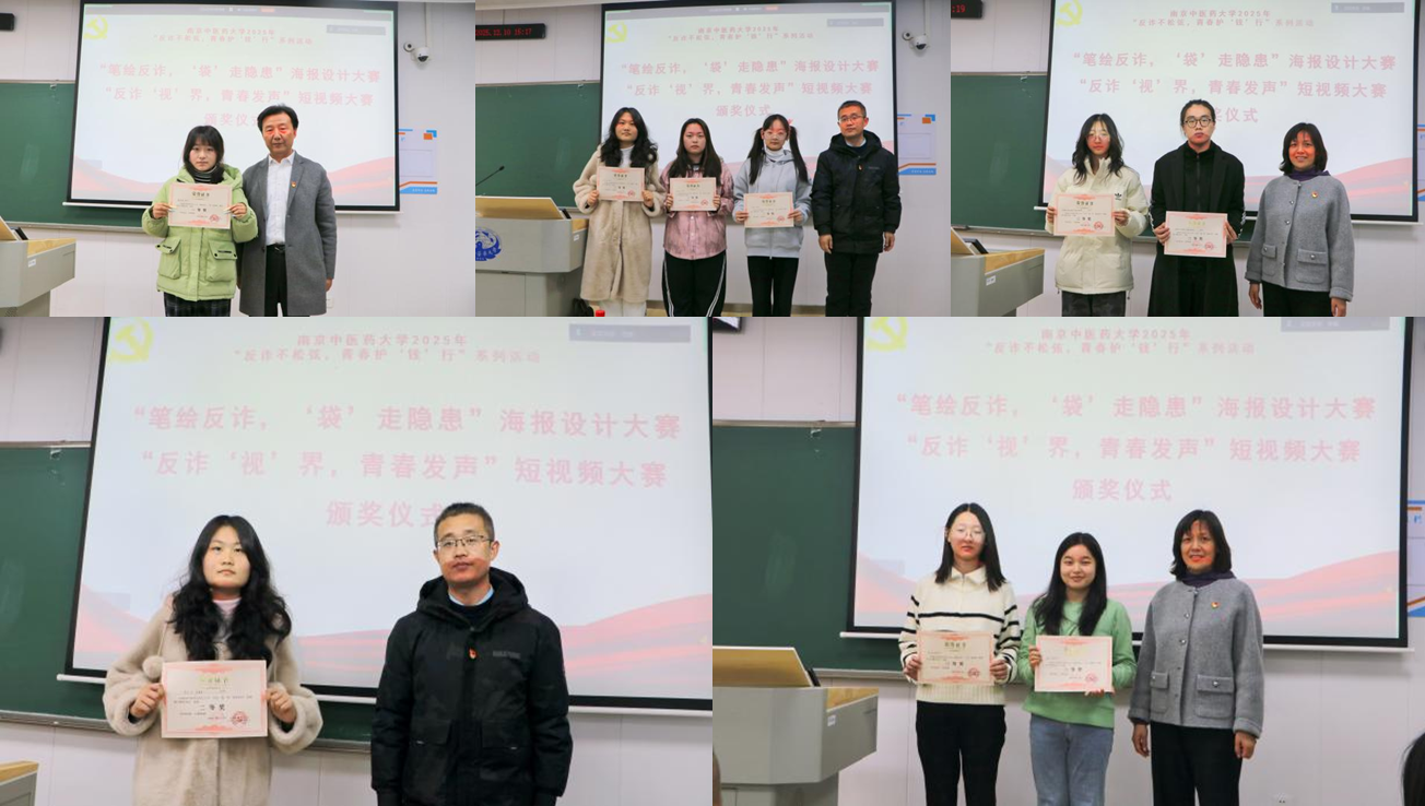 笔绘反诈筑防线,青春发声护平安。同学们以笔为剑、持镜作盾,在“笔绘反诈,‘袋’走隐患”海报设计大赛和“反诈‘视’界,青春发声”短视频大赛中,创作出一批主题鲜明、形式新颖的反诈宣传作品,展现出南中医学子出色的创造力与强烈的责任感。经网络投票与工作组评审,邱国梁等23位同学的作品脱颖而出,斩获奖项。现场由颁奖嘉宾为获奖同学颁发证书并合影。