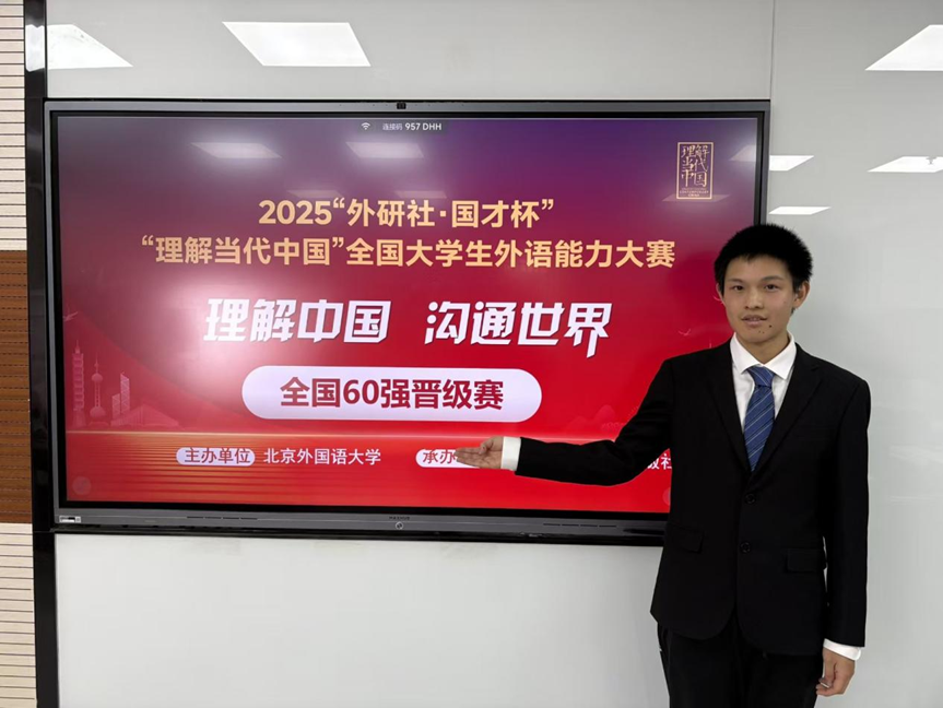 近日,2025“外研社·国才杯”“理解当代中国”全国大学生外语能力大赛全国总决赛在北京外国语大学圆满落幕。我院2022级公共事业管理(中外合作办学)专业1班学生康弘毅凭借扎实的英语语言功底、深厚的知识储备与稳定的临场发挥,在英语组国际传播综合能力赛项中脱颖而出,再次荣获全国总决赛银奖。至此,我院已连续两年在该项赛事全国总决赛中斩获银奖,成绩斐然。