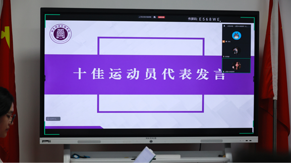 “十佳运动员”代表、公管242班杨郅轩同学线上讲述了在赛场上不断挑战自我、奋力拼搏的动人故事,展现了昂扬的体育精神。