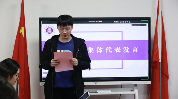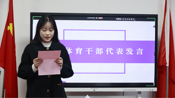 “体育先进集体”获奖代表、国贸23班体育委员杨天一同学分享了班级同学积极参与校院两级体育赛事的经历,生动阐释了“以体育人、以体聚力”在提升班级凝聚力方面的实践与感悟。
