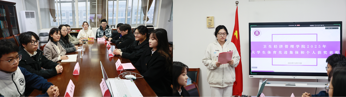 2025年12月11日下午,南京中医药大学卫生经济管理学院在B11-502会议室召开2024-2025学年大学生体育先进集体和个人表彰大会。泰州校区学生代表通过线上方式同步参与。学院党委副书记、副院长沈静,团委书记刘小平,辅导员闫壮壮、左桂出席会议。大会由院学生会主席团成员蒋钰烨同学主持。