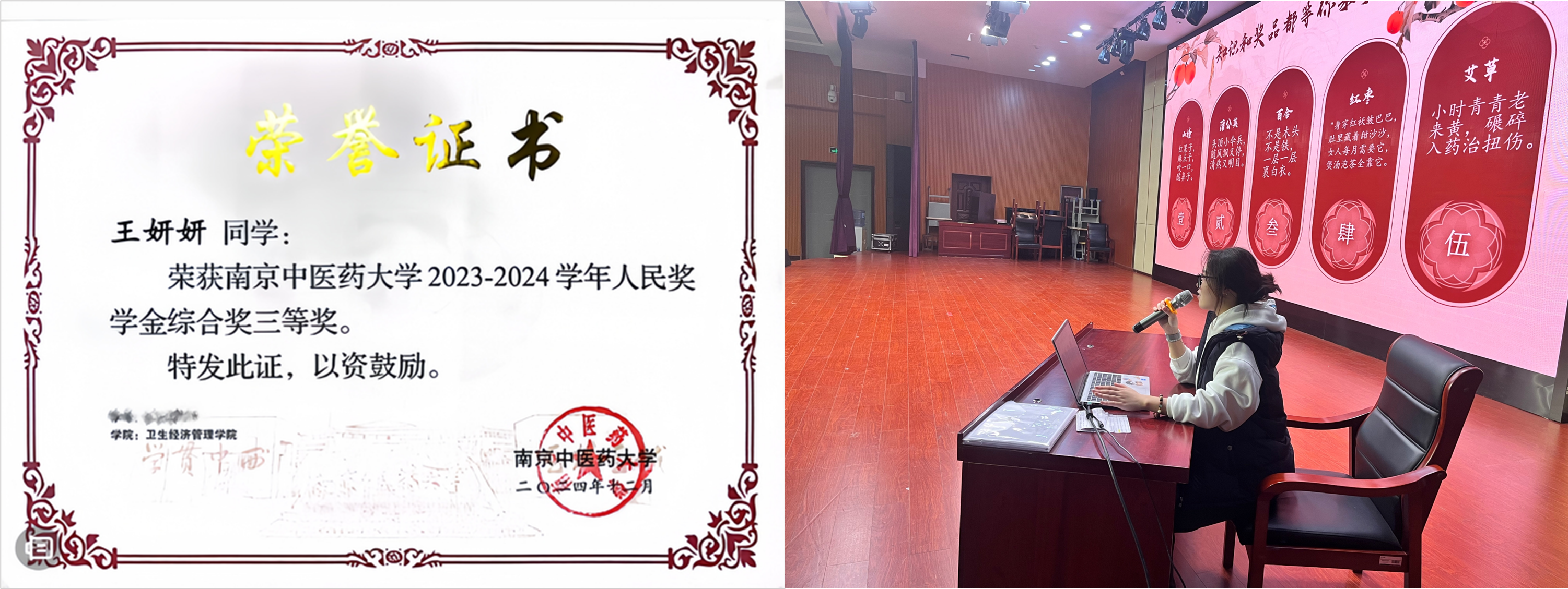 王妍妍,女,汉族,中共预备党员,江苏苏州人,南京中医药大学卫生经济管理学院2022级公共事业管理(中外合作办学)专业本科生;曾任卫生经济管理学院大学生就业创业协会理事层、江苏省中医药博物馆首批讲解员、班级班长、宣传委员等职;带领班级荣获2025年度“十佳班级”称号,参加南京中医药大学70周年校庆剧目表演、2024年度南京中医药大学五四表彰活动;多次获评人民奖学金、校院级“优秀共青团员”、院级“优秀学生干部”,荣获江苏省第七届大艺展朗诵群诵组二等奖;积极投身志愿服务,累计志愿时长达200小时以上;作为第一主持人主持“挑战杯”江苏省大学生创新创业计划项目;雅思成绩7分,已获香港大学硕士及香港城市大学硕士录取资格。