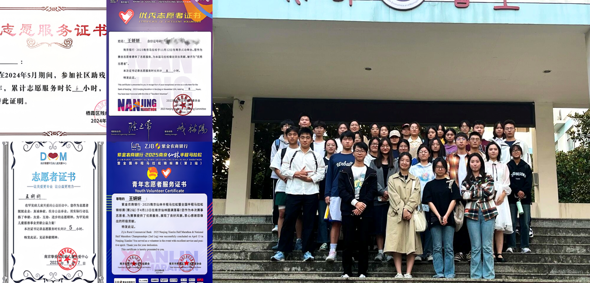 她是班级里凝心聚力的“主心骨”,从日常事务的细致统计到关键节点的统筹协调,始终以责任为底色,带领公管222班在“十佳班级”答辩中脱颖而出,将集体荣誉镌刻成共同的青春勋章。社团里,她倾注心血为社员培训赋能,以智慧为社团发展出谋划策。聚光灯下,她用声音点亮光芒——校主持人大赛二等奖、江苏省第七届大艺展朗诵群诵二等奖(队长),七十周年校庆情景剧《根脉》里深情演绎家国情怀,五四颁奖典礼上以《青春最美的模样》诵出热血与担当。志愿服务中,她为“为罕奔跑”义卖守护罕见病儿童的微笑,多次以热情服务南京马拉松跑者,用陪伴传递社区助残的善意与尊重。从舞台聚光灯到平凡烟火处,她相信微光虽小、聚之可成星河。