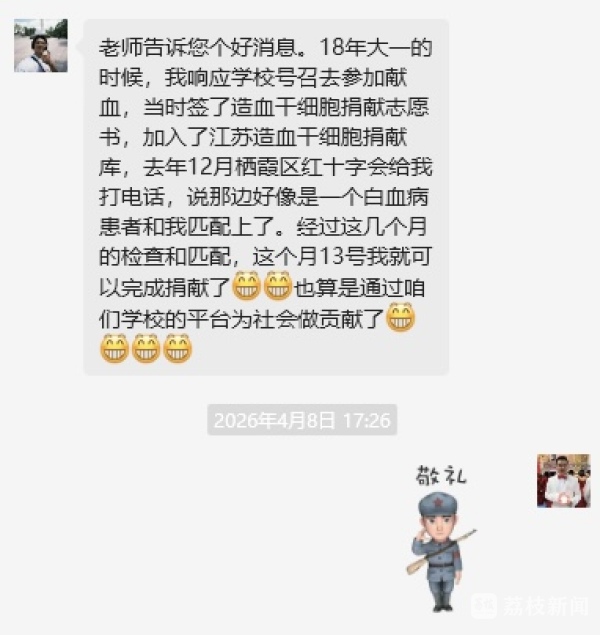 2025年12月,栖霞区红十字会告知梁照鼎与一名白血病患者配型成功。得知消息后,这位毕业四年的校友毫不犹豫同意捐献,并全程配合完成高分辨配型与全面体检。在与原班级辅导员郑贵宝老师的对话中,他谈及捐献的初心,作为一名医学院学生、一名预备党员,救死扶伤、帮助他人是自己义不容辞的责任;更感恩国家“对口援疆”政策,让自己有机会进入南京中医药大学学习,在母校的培养下成长为有担当的青年,也希望借此机会感恩母校、回馈社会,为公益事业贡献力量。
